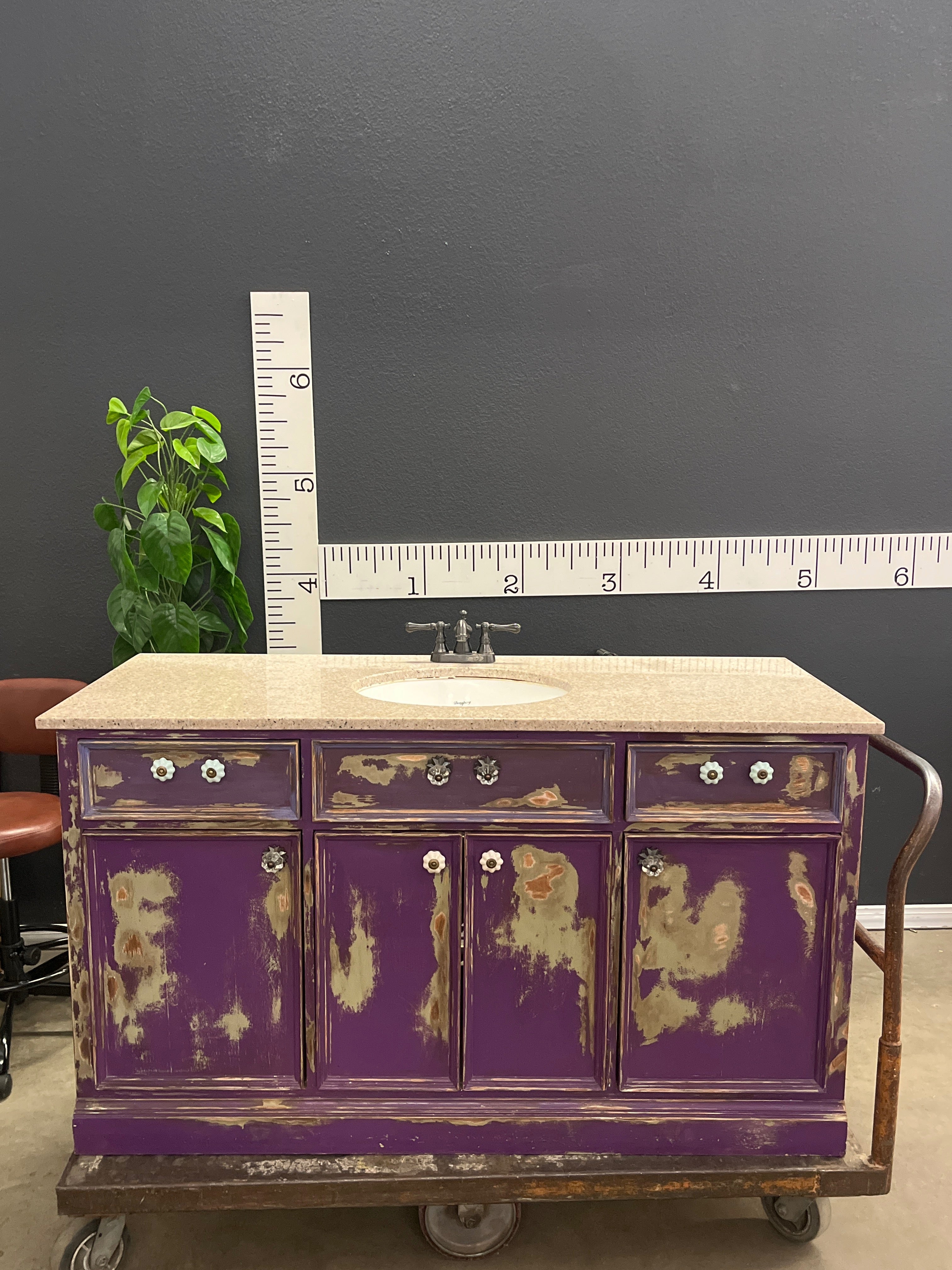 A charming vintage vanity cabinet featuring a distressed purple finish. The cabinet includes a countertop with an integrated sink, perfect for adding a pop of color to your bathroom. The worn look gives it a unique character, ideal for rustic or eclectic interiors. Approximate Size: 3 x 4 x 2