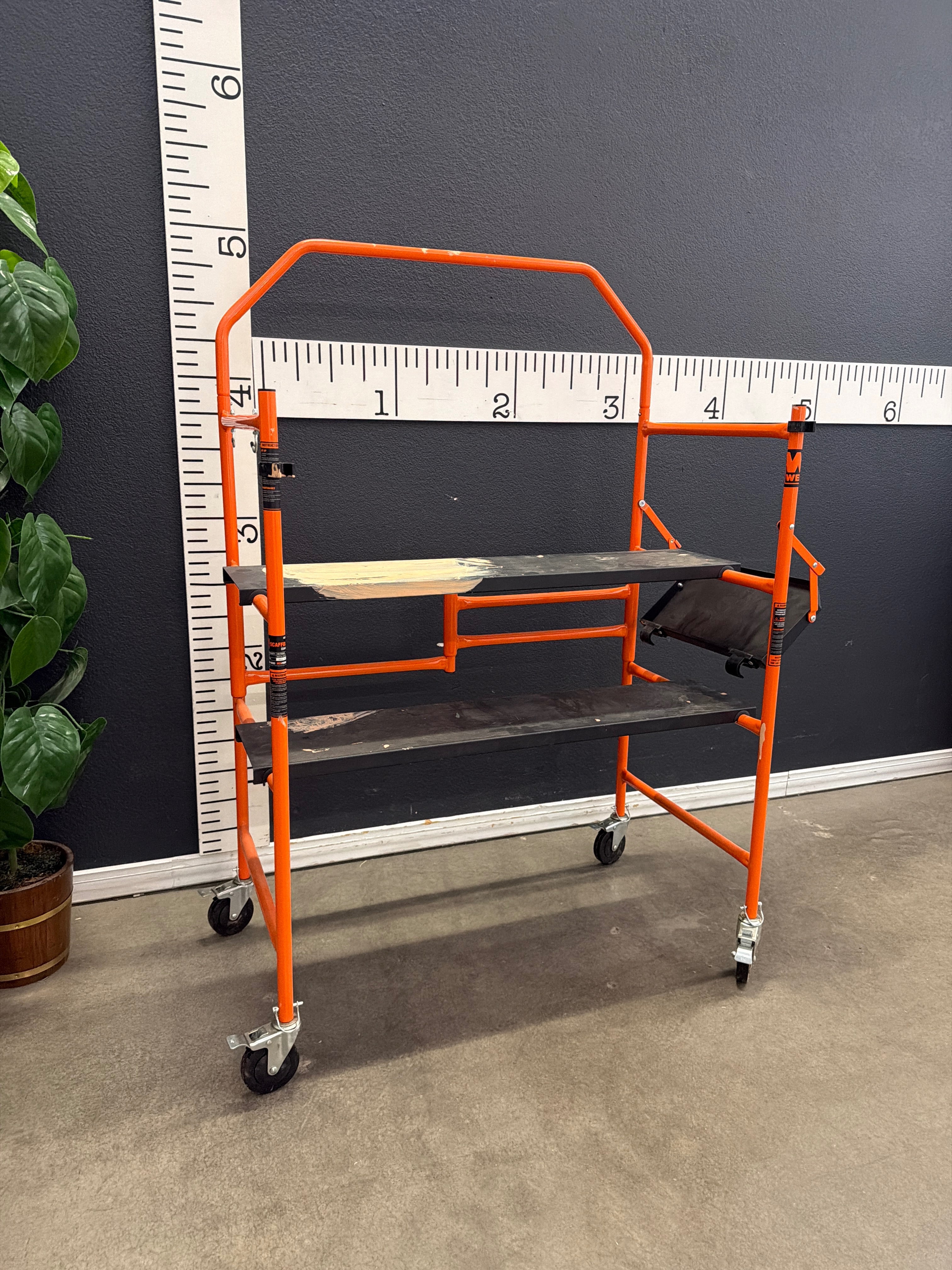 This vibrant orange scaffold is crafted from sturdy metal for enhanced durability. It features a powder-coated finish for a sleek and protective layer against wear and tear. The scaffold is equipped with locking caster wheels for easy mobility and stability. Approximate Size: 6 x 4 x 2