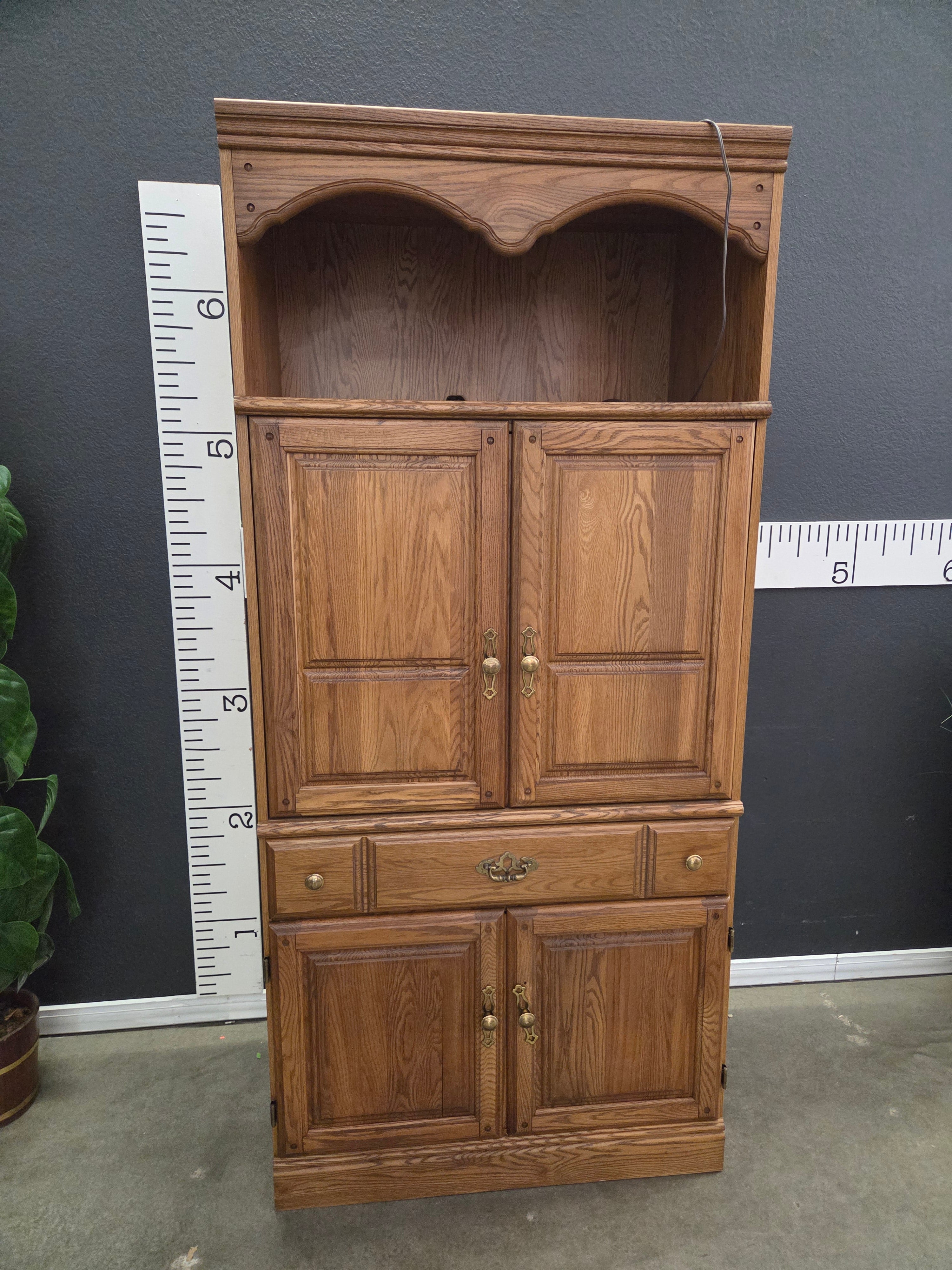 This beautifully crafted vintage oak cabinet features a warm brown finish with intricate paneling. It provides ample storage space with two large compartments and a drawer, making it ideal for your living room or dining room needs. Approximate Size: 6 x 3 x 1.5