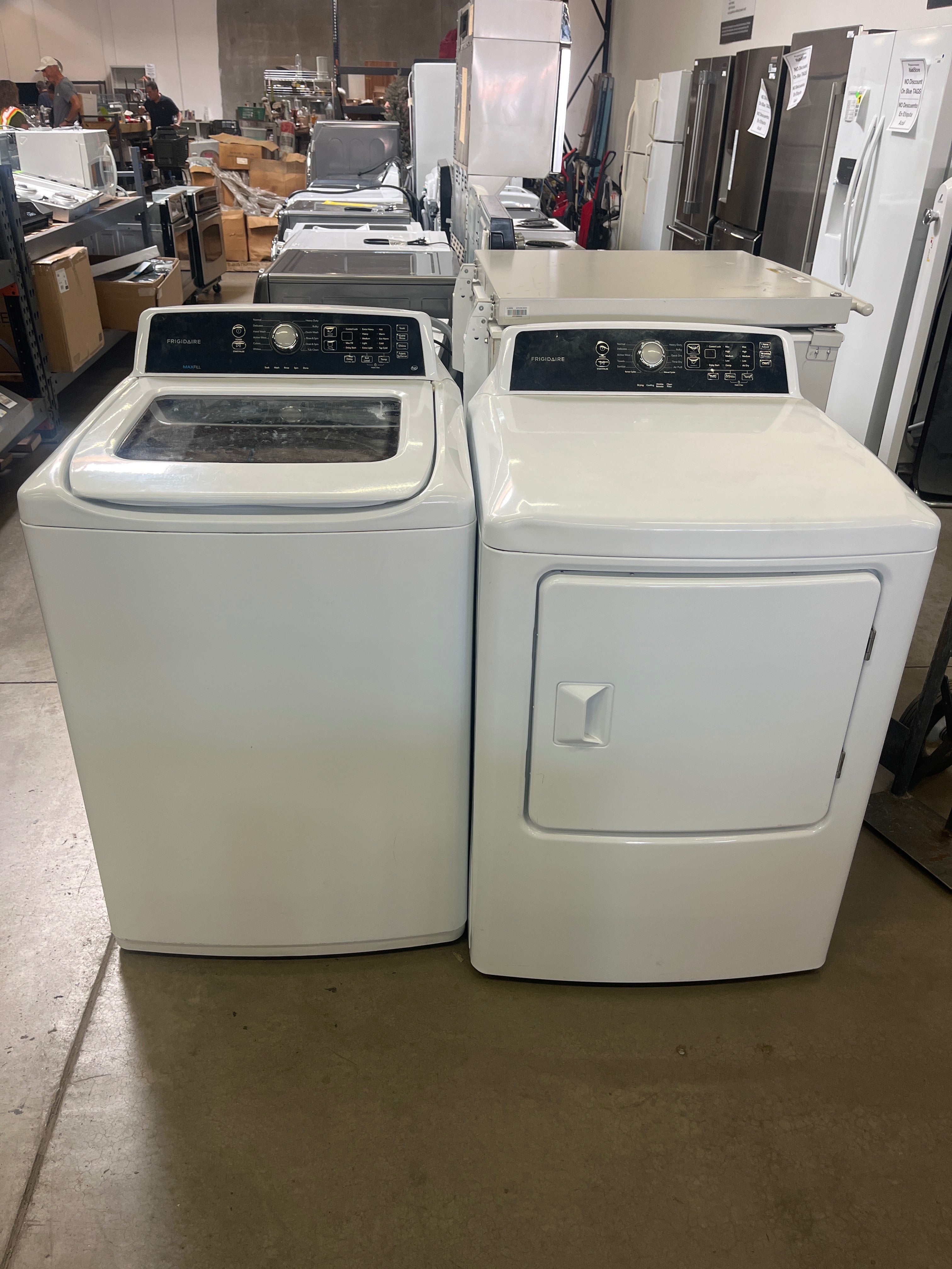 This Frigidaire washer and dryer set features a sleek white finish with a durable, smooth surface. Both units provide a reliable laundering experience and are perfect for keeping clothes fresh and clean. Approximate Size: 3.5 x 5 x 2.5