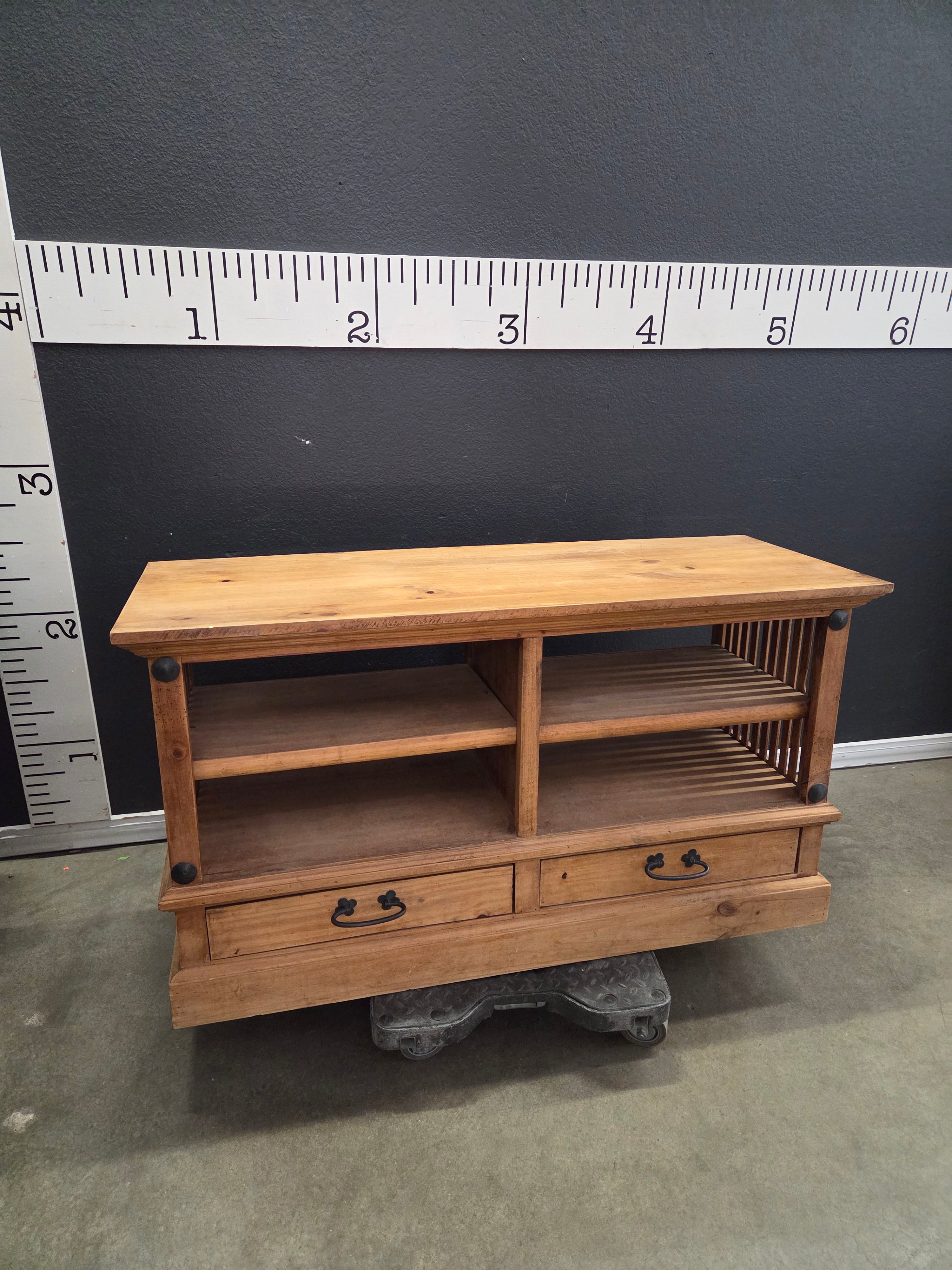 This rustic wooden media console features a natural wood finish with a sturdy construction. It has open shelving for media devices and a small drawer with decorative metal handles for additional storage. Approximate Size: 2 x 3.5 x 1.5