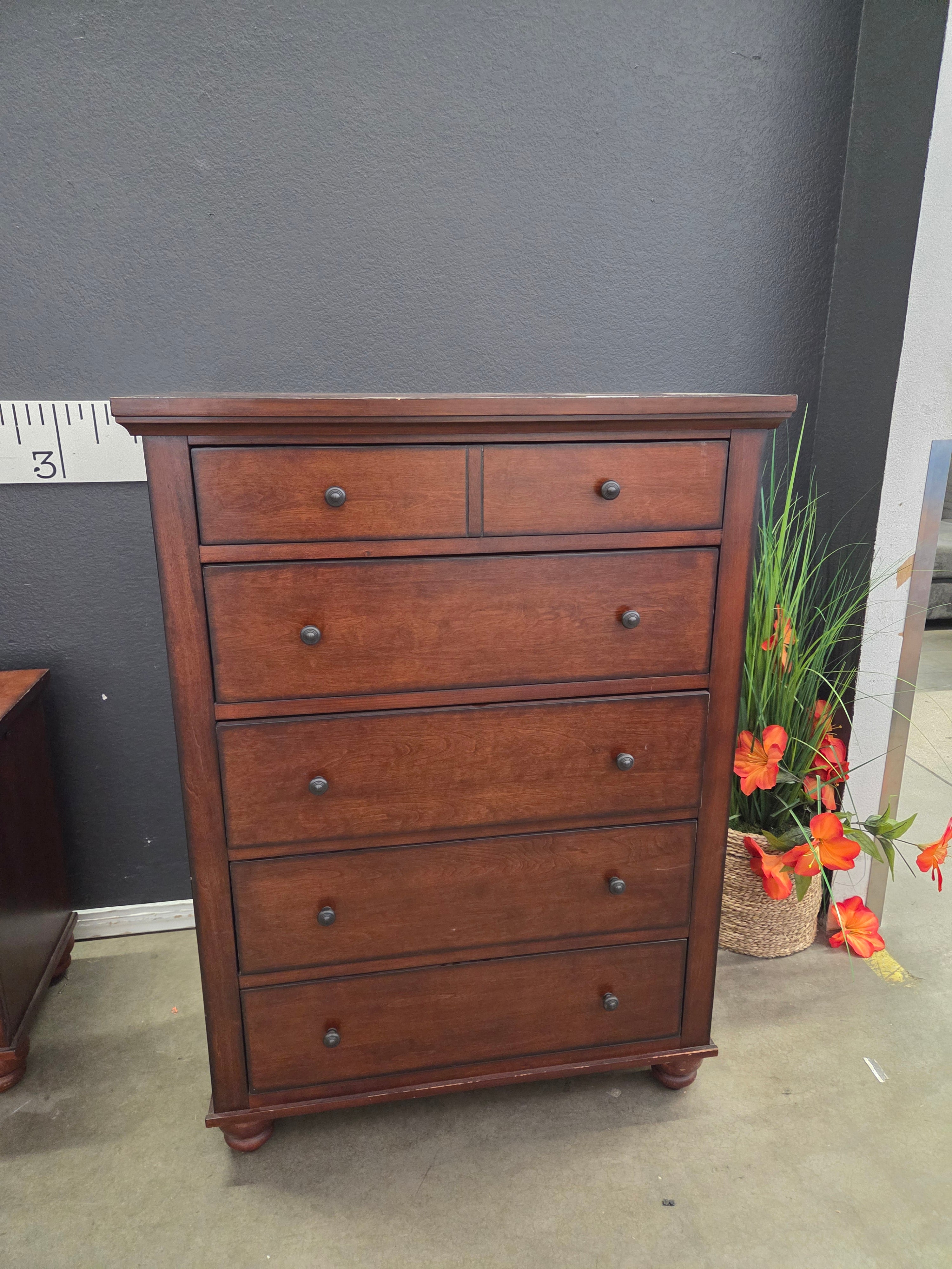 This classic dresser features a rich brown finish with a smooth, polished surface. Its five spacious drawers provide ample storage, making it a perfect addition to any bedroom setting. Approximate Size: 4.5 x 3 x 1.5