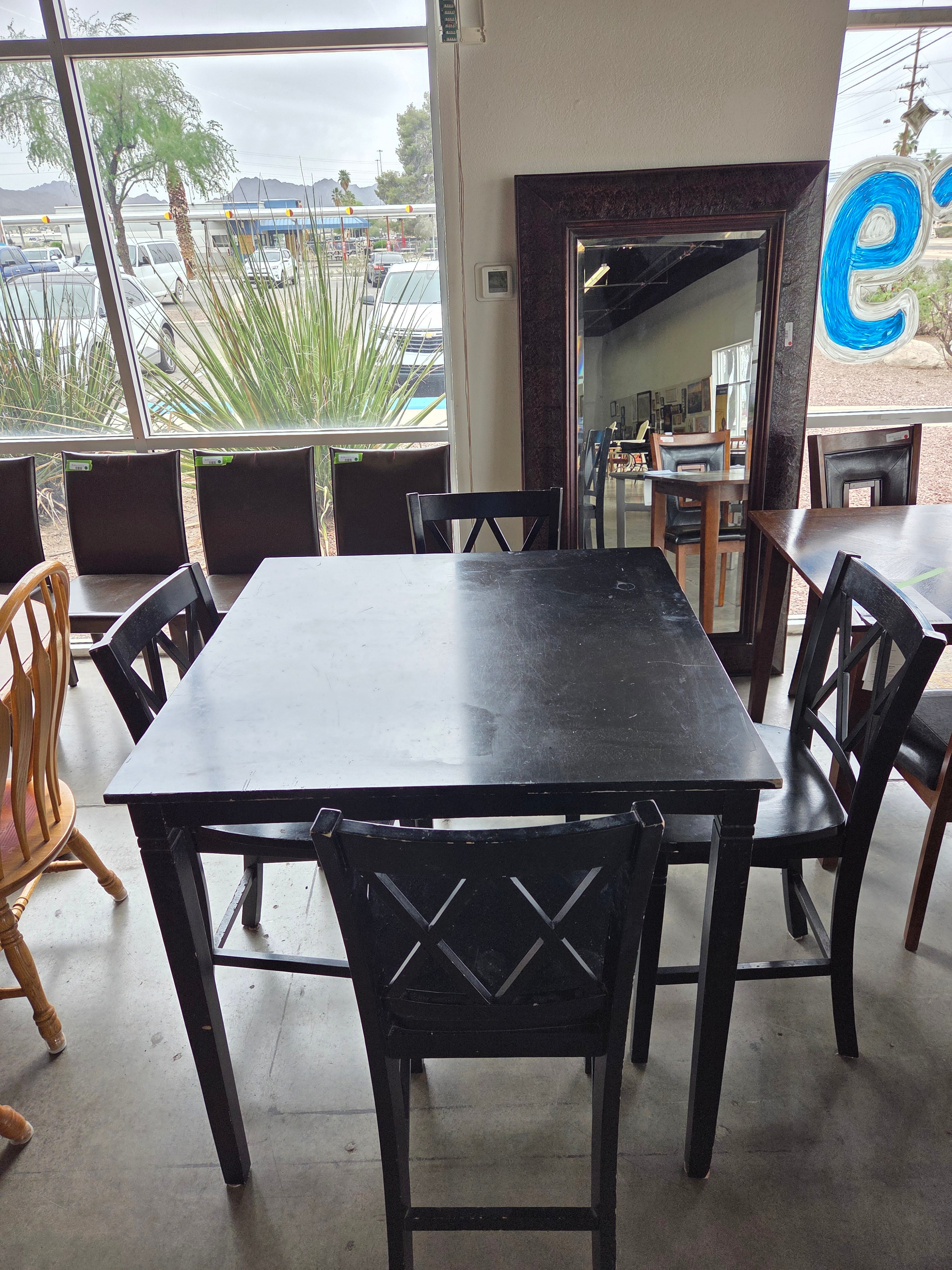 A sleek black dining set featuring a square table with a smooth finish and matching chairs. This is a perfect addition to your dining room for a modern yet functional look. Approximate Size: 3 x 4 x 4