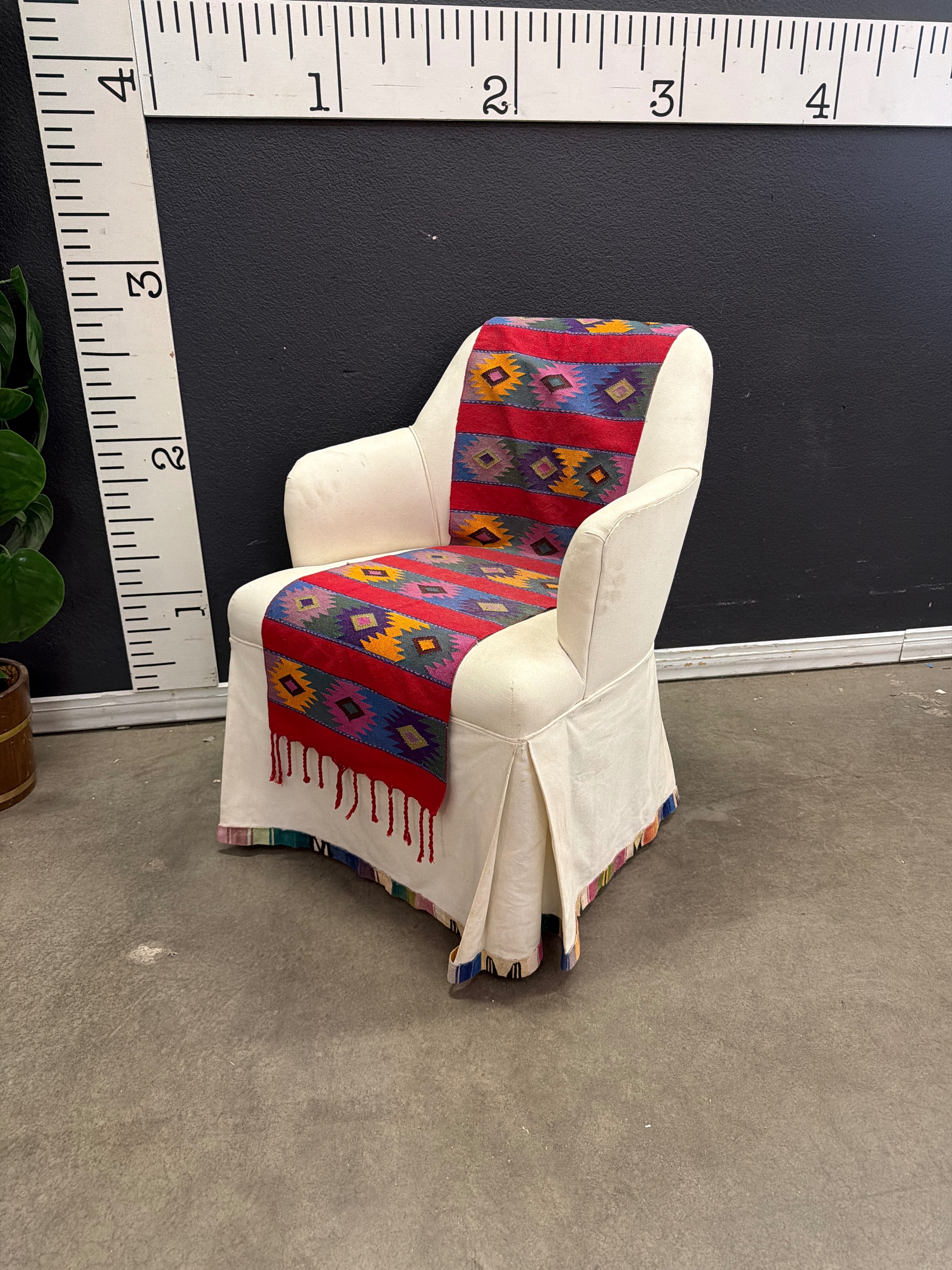 This charming armchair features a unique Southwestern pattern in vibrant reds, blues, and yellows. The chair is upholstered in a soft beige fabric with a colorful woven fabric draped over the back and seat, providing both style and comfort. Approximate Size: 3 x 2.5 x 2