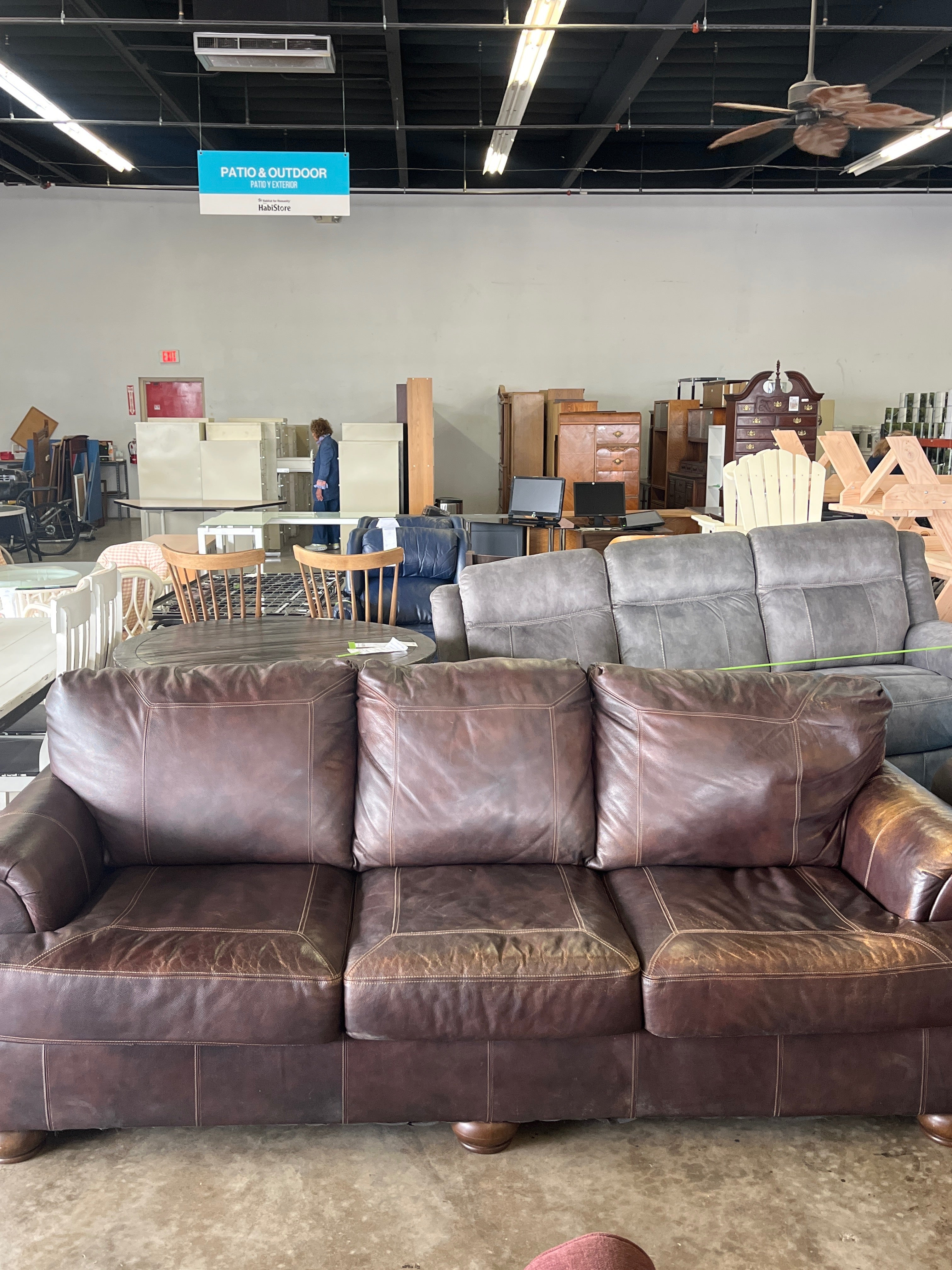 This classic sofa features a rich, brown leather finish, offering a timeless look with a comfortable feel. It's perfect for adding a touch of elegance to any living space. Approximate Size: 3 x 6.5 x 3