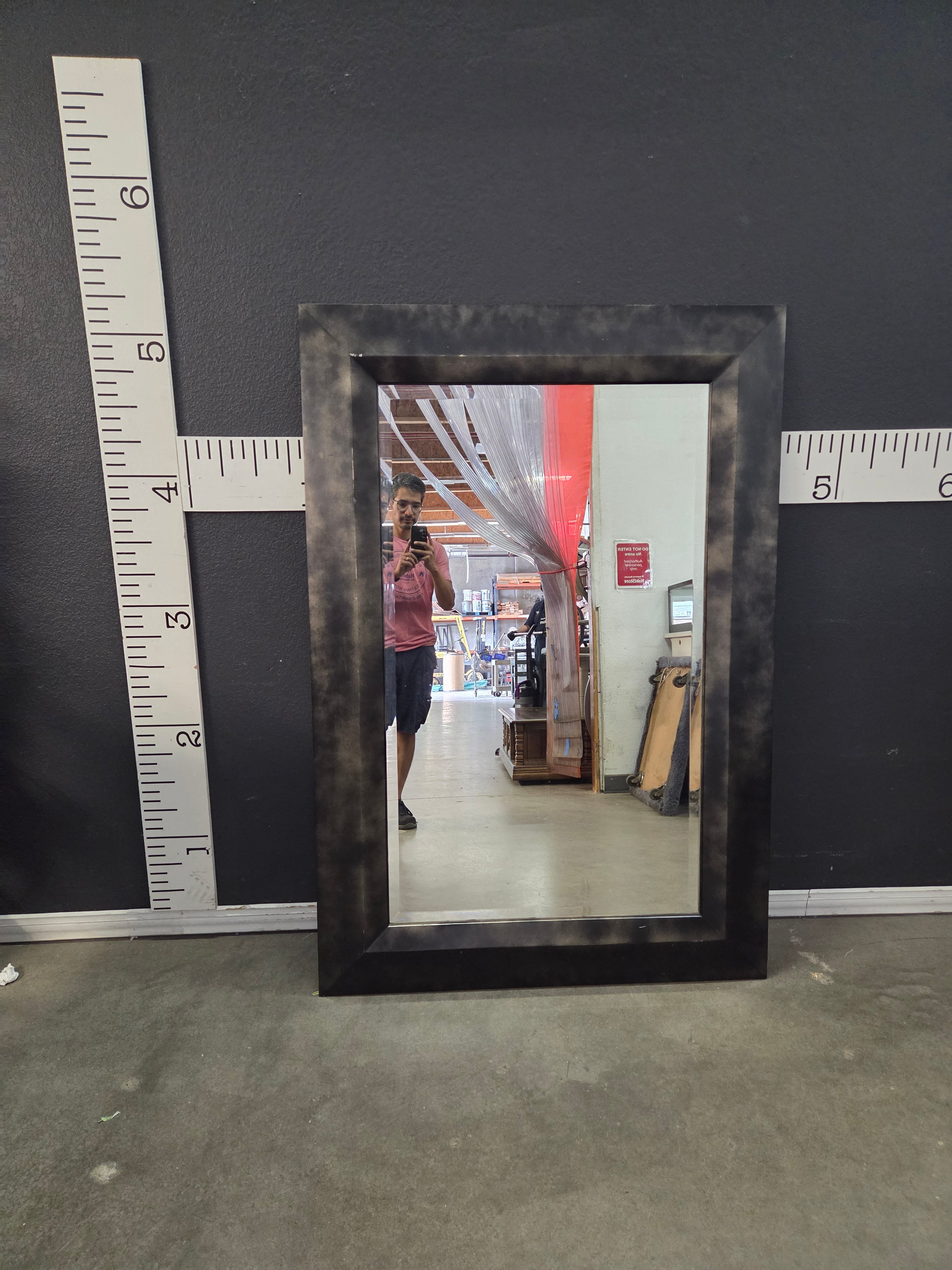 This elegant wall mirror features a distressed black frame with a matte finish, adding a touch of sophistication and modern style to any room. Approximate Size: 6 x 3 x 0.5